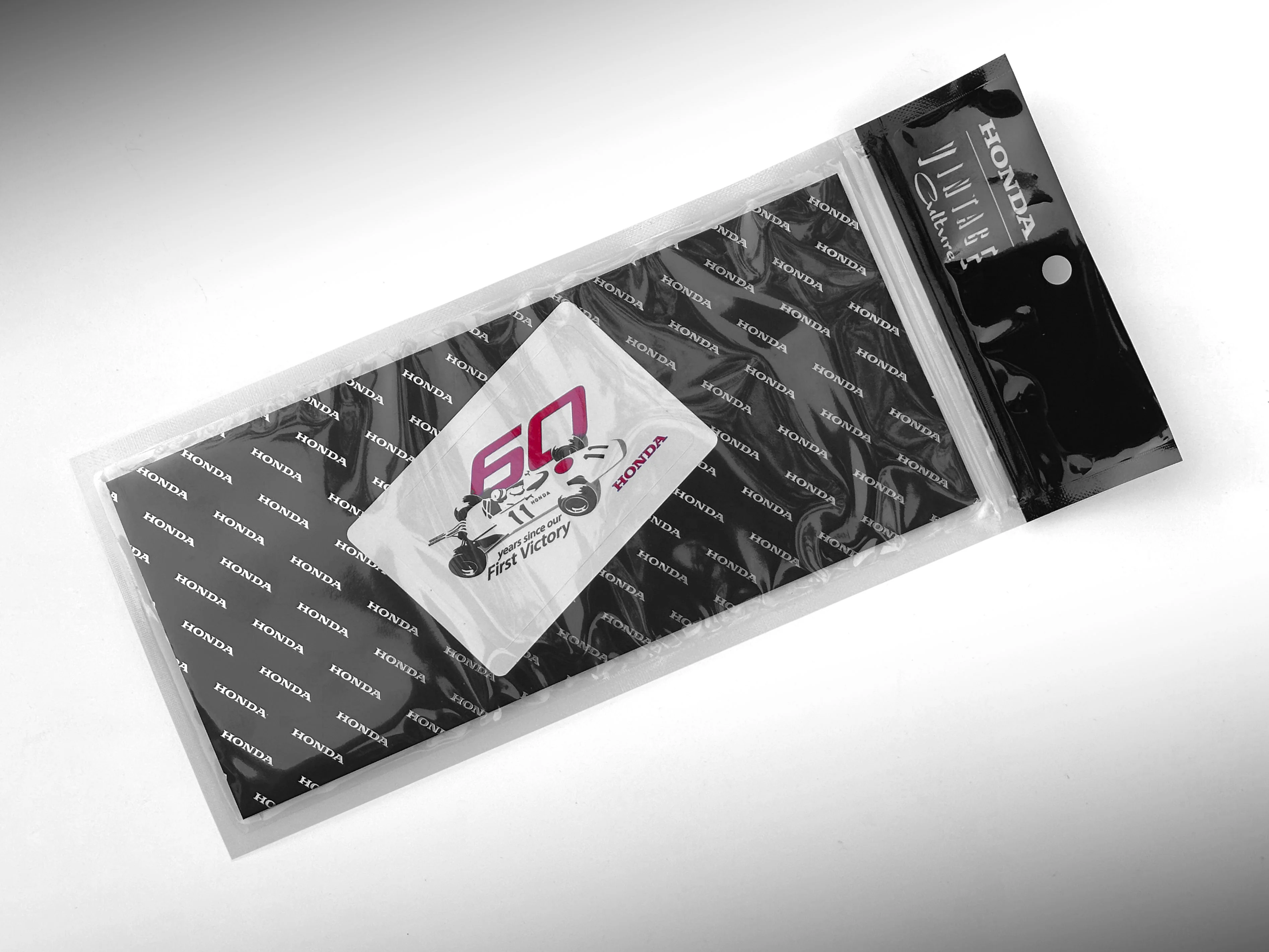The official Honda F1 60th Anniversary First Win logo, designed by Honda Motor Co., LTD. Sticker uses premium adhesives and comes packaged in a resealable pouch.